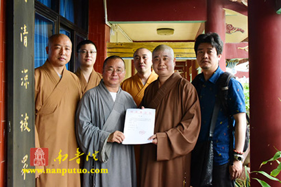 2016年6月12日上午,正值闽南佛学院第八届研究生毕业论文答辩之际,原妙湛和尚衣钵、终南山净业寺住持本如法师积极响应支持南普陀寺、闽南佛学院“妙湛和尚纪念堂”的筹建工作,专程恭送妙湛和尚的祖衣、法卷、十世班禅大师送给妙老的哈达等妙老的法物回南普陀寺。则悟方丈携后堂净心法师,副寺弘来法师、界淞法师,衣钵兼知客法旺法师等在慈善会三楼会议室恭迎妙老法物。