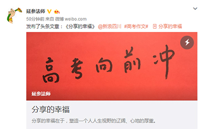 6月7日,高考作文题一出立马引起网友热议,各位“玩家”更是摩拳擦掌,跃跃欲试。不论段子手还是大学霸都能来露一手才华,真是全民高考大作文!晚上八点过,有网红和尚之称的延参法师在自己微博上po出一篇四川高考的同题作文,取名“分享的幸福”,文采奕奕之外更像是讲述生命哲理,劝诫人生,附上全文,你萌感受一下!