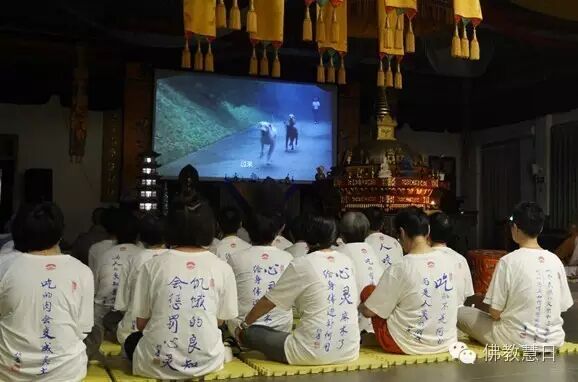 晚上在法堂组织观看电影《导盲犬小Q》,影片讲述了一只导盲犬的一生,将人与动物间淳朴的情感以最为平实的手法给予了呈现,影片所传达的人与狗的亲情令人动容。