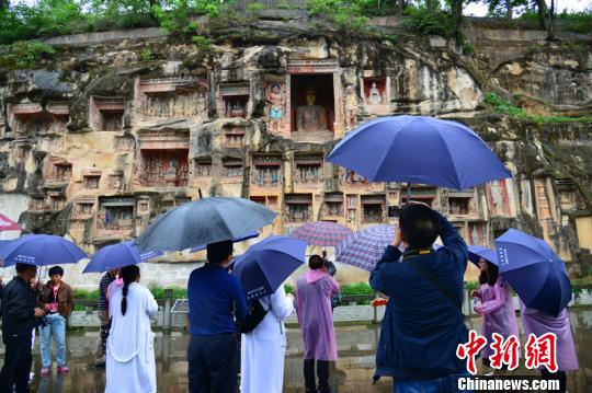 海外华文媒体冒雨参观始创于南北朝的巴中南龛石窟摩崖造像群苗志勇摄