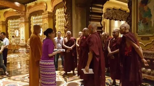 参观舍利藏宫之后,长老一行来到舍利大殿,虔诚的瞻拜了供奉于舍利大塔内的诸圣舍利。缅甸的长老们对舍利大殿里精妙绝伦的建筑艺术和工艺品展陈赞叹不已,不停感叹“未曾见过”,并与这里留下很多合影。离开舍利大殿后,长老们乘最美扶梯“法雨流芳”上行来到禅境大观,齐绕卧佛一周,虔诚祈祷,并观看了唯美殊胜的敦煌飞天舞演出《如莲佛颂》。