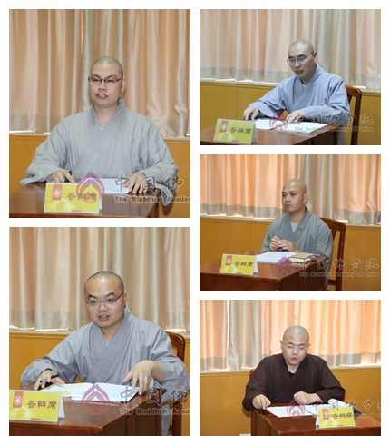 答辩会严格依照中国佛学院硕士研究生论文答辩程序和答辩委员会会议要求进行。首先由答辩委员会主席宣布参加答辩的研究生名单及其所提交的毕业论文题目以及该研究生的指导老师姓名,接着进行具体答辩。参与答辩的研究生分别陈述自己毕业论文的内容,进而答辩委员会委员分别对论文进行点评、提出问题。最后由该生对各位评委法师、老师的问题给予回答。五位研究生先后进行了精彩的答辩。评委们对所有论文进行了认真的点评,给予了高度的评价,一致认为,参加答辩的所有论文学术规范、结构谨严、资料翔实、说理清晰,在某些问题上有着自己的创新和独到见解,有一定的学术价值。同时,评委们也提出了许多宝贵、中肯的修改意见。