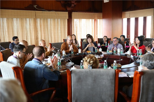 6月5日,在北京外国语大学国际交流与合作处处长柯静教授的陪同下,来自丹麦、阿尔巴尼亚、波兰、荷兰、斯洛文尼亚等20个国家的32位外国专家等,到龙泉寺进行参访,并同学诚法师座谈交流。