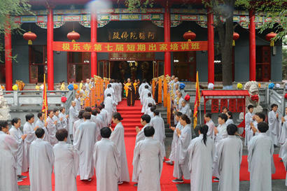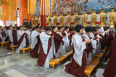 2016年7月27日,诸佛生欢喜,龙天降吉祥。来自于四面八方的四百余名新戒们在经过了佛学基础考试、学习威仪、请引礼师、露罪忏悔、男众剃度后,迎来了传授沙弥戒、八关斋戒这一庄严的时刻。
