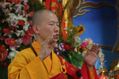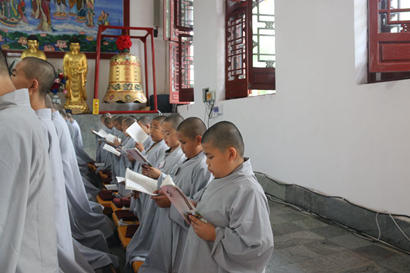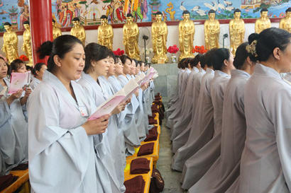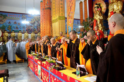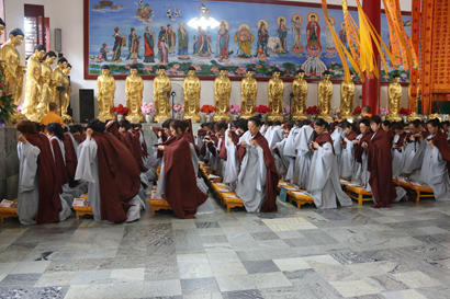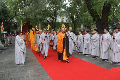 受戒结束后诸位戒子至诚顶礼和尚三拜,分班而立,恭送三师七证回寮。