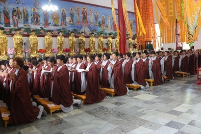 戒堂内,三师和尚殷殷教导新戒,常随佛学,弘扬正法。悲心感动众戒子,新戒们长跪佛前,克诚披露,惟愿三宝慈悲摄受。