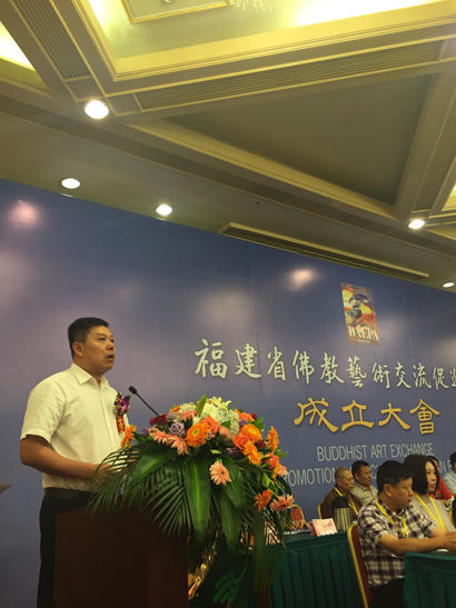 成立大会得到了各级党政部门、佛教界及艺术界的高度重视,福建省政协民宗委、福建省佛佛教协会、厦门市佛教协会等单位为福建省佛教艺术交流促进会的成立发来了贺电。福建省民宗厅厅长黄进发先生、促进会首届名誉会长道元大和尚、向愿大和尚与会道贺并致辞。黄进发厅长在致辞中指出:希望福建省佛教艺术交流促进会要把服务国家、奉献社会作为主要职责,通过平台优势,推动中华优秀的传统艺术之一——宗教文化走出去,在促进国家和平发展中做出积极努力。促进会的工作要致力于我省佛教艺术的研究与弘扬,要凝集正能量、传播正能量、弘扬正能量,坚定走佛教与社会主义社会相适应的道路,为实现两个一百年的奋斗目标,实现中华民族伟大复兴的中国梦贡献力量。