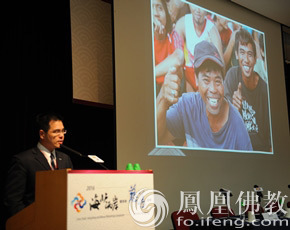 慈济基金会宗教处黄晟佑专员,在论坛中分享慈济救灾的宝贵经验,并说明救灾过程中,不分团体、对象,广阔的爱心就是连结大家救灾最大的力量。(图片来源:凤凰佛教 摄影:慈济香港分会)