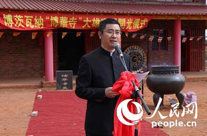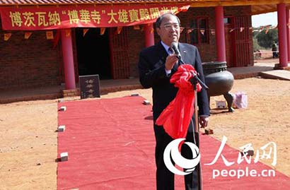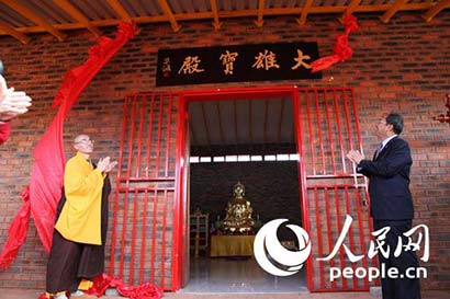 郑竹强大使和贤双法师为大雄宝殿揭牌(图片来源:人民网)