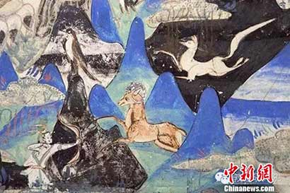 莫高窟第285窟一幅狩猎图,画面描绘的是一只羊在山峦间跳跃奔跑,而一位猎人则弯弓搭箭相向。(图片来源:敦煌研究院供图)