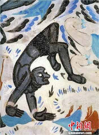 莫高窟第249窟一幅倒立力士图显示出早期壁画,呈简率、粗犷,具有创新性的特点,这在总体庄严、肃穆的佛教艺术中并不多见。(图片来源:敦煌研究院供图)