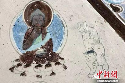 敦煌研究院认为,这幅童子倒立图是画应是古代画师即兴发挥的谐趣小品。(图片来源:敦煌研究院供图)