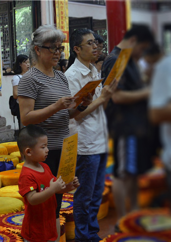 妙那师兄今天也是全家都来皈依。她说,以前自己的性格不是很好,遇到事情总会钻牛角尖。去年开始,慢慢接触了佛法,学习了很多佛教知识,感觉自己的性格开朗了,情绪也稳定多了,周围朋友也看到了自己的变化。现在很多事情都能想得开,佛法很有启发和帮助,接触佛法是很开心的。