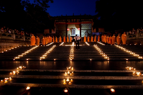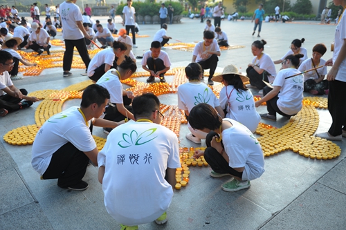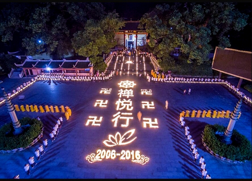 义工们将传来的每一盏酥油灯摆放在“卍”字图案与“禅悦行”标志的灯阵之中,万盏酥油灯光在微风中缓缓摇曳。此时此刻,灯灯相连,心心相映,千年宝刹,盏盏明灯交相辉映,大家沉浸在无限温馨祥和的氛围之中。传灯法会圆满结束。