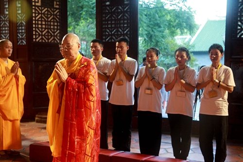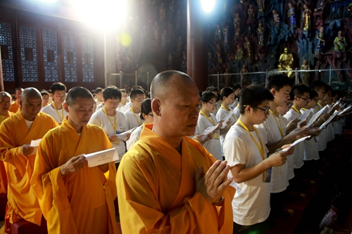 在法师们的带领下,营员们迎请传正大和尚为本届营员传灯,全体营员诵经发愿后,传正大和尚至大雄宝殿供桌前点燃第一盏莲花灯,并做了简短而精彩的开示:“祖道传灯有胜俦,英才学子此中收;好将一滴曹溪水,化作江河万古流。”