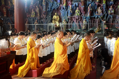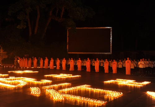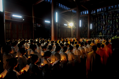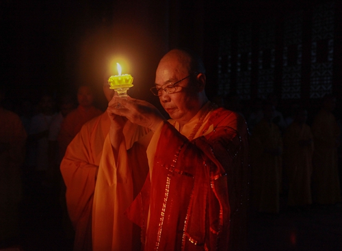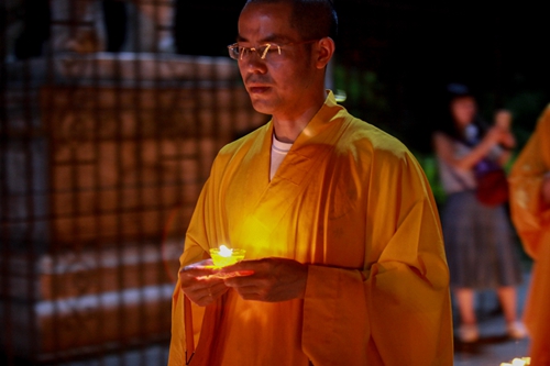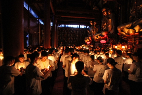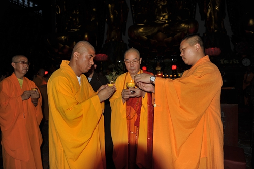 大众向上问讯后执灯,领众法师依次序出班,至大和尚前点灯,并依次传递至其他法师,再一一传到各营员手中。