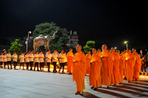 随后,全体法师及营员们手捧象征光明和智慧的莲花灯,默默许愿,缓缓前行,直至曹溪广场。所过之处皆摆满莲花灯,这些灯犹如点点佛光,照亮了南华禅寺的夜空,也照亮了诸位法师和营员们的心。行至广场上,营员们在法师们的带领下,按照指定的路线称念佛号,欢喜绕行。