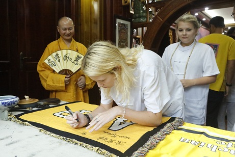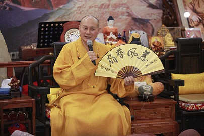 这是一把具有中国古典文化意境的扇子,现在给大家每一位发一把,上面四个字是我题写的——“慈风普扇” 。