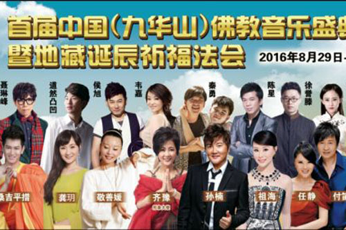 “明星演唱会每年都可以看,而错过九华山佛教音乐盛典也许要再等二十年。”这场被期待已久的中国(九华山)佛教音乐盛典将于2016年8月29日-30日晚在安徽九华山风景区九华大佛景区隆重上演,届时孙楠、齐豫、敬善媛、桑吉平措、祖海、付笛生、任静、秦勇、黄龄、杭天琪、龚玥、陈星、侯旭、韦嘉、吉星、何军、朱美璇、徐誉滕、黄勇、聂琳峰等数十位明星艺人亲临现场献唱。
