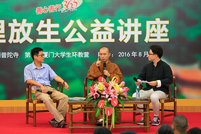 当天下午14:30,本次活动还在南普陀寺讲堂内举办了“合理放生”为主题的公益讲座,邀请厦门南普陀寺副寺悟云法师及厦门爱护动物教育协会常务副会长萧冰分别从宗教角度和爱护动物角度讲解有关知识,围绕“什么是放生,为什么要放生以及如何正确的放生”等问题进行解读。