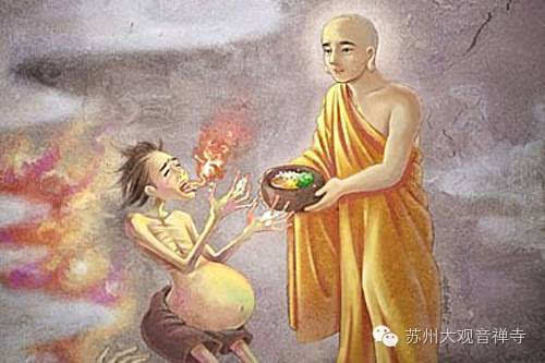 据《佛说盂兰盆经》记载,被誉为“神通第一”的佛陀弟子目连尊者在最初获得天眼通时,观察其母堕在饿鬼道中,便为母亲送食。目连母因为业力的缘故,饭食下咽后都变为火炭,目连为拯救其母脱离此苦,乃向佛陀请示解救之法,佛指示目连于七月十五日佛欢喜日以美味饮食置于盂兰盆中供养自恣僧,仗三宝慈悲力,可以解救今世乃至七世父母及六亲眷属的罪业。目连依教奉行,其母即时解脱饿鬼痛苦,升为天人。