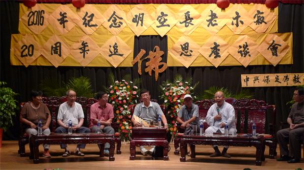 在七月初二晚的“明空长老示寂20周年追思座谈会”上,会长真广法师在追忆自己的恩师时讲到:二十年来我们一直在怀念老和尚的功德,一直在实践老和尚的教导。在昨天晚上我还为老和尚写了一首偈子:“虔心入道,朴信无华。劫波历尽无悔怨,归心法王家,灯传保定,大愿永无涯!”老和尚在世时对寺院的建设都是亲力亲为的。说到老和尚的简朴,用水多一点,都会忏悔。出去开光时都会叮嘱居士多带塑料袋,将切剩下的白菜疙瘩装回来,不要浪费。今天我们缅怀老和尚,就是要继承,继续发扬老和尚的这种精神,努力为大众、为社会做贡献。
