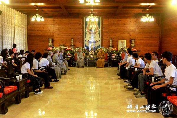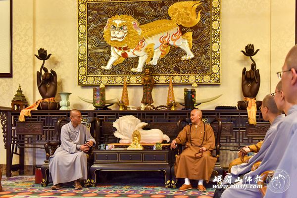 2016年8月6、7日,台湾法鼓山副住持果品法师一行二十余人赴峨眉山参访、礼佛,受到峨眉山僧众的热情接待。峨眉山方丈永寿大和尚在东花园接待了果品法师一行并亲切交谈,大和尚向来宾介绍了峨眉山佛教文化、僧才教育及康养、慈善事业的现状及发展规划,并与来宾就此三方面加强合作进行了深入的探讨,果品法师感谢大和尚及全山僧众的热情接待,表示法鼓山与峨眉山在慈善、教育方面合作与交流的空间很大,希望双方携手共进,为推进两岸佛教文化事业的发展作出新贡献。