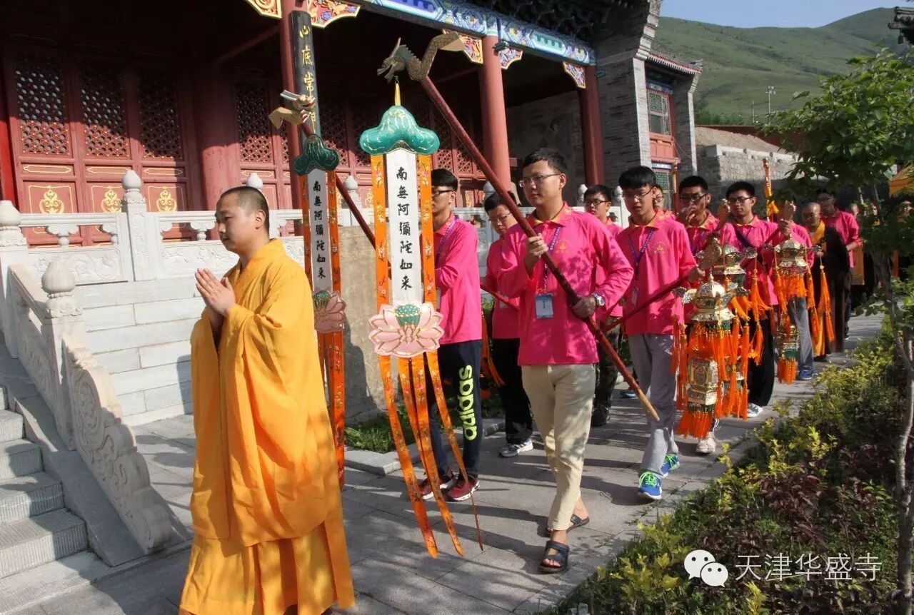 由夏令营营员组成的庄严的仪仗队恭请妙江大和尚