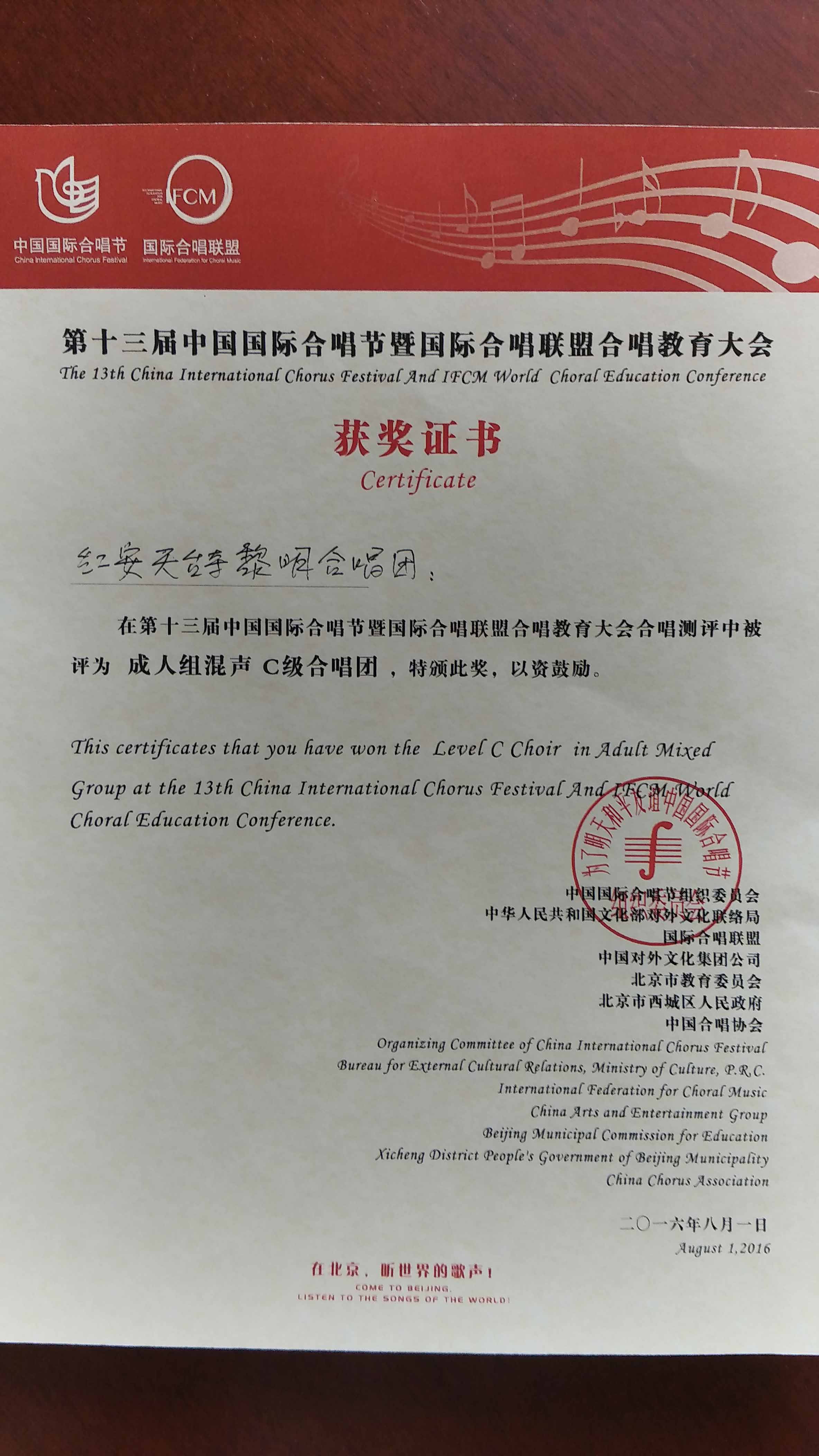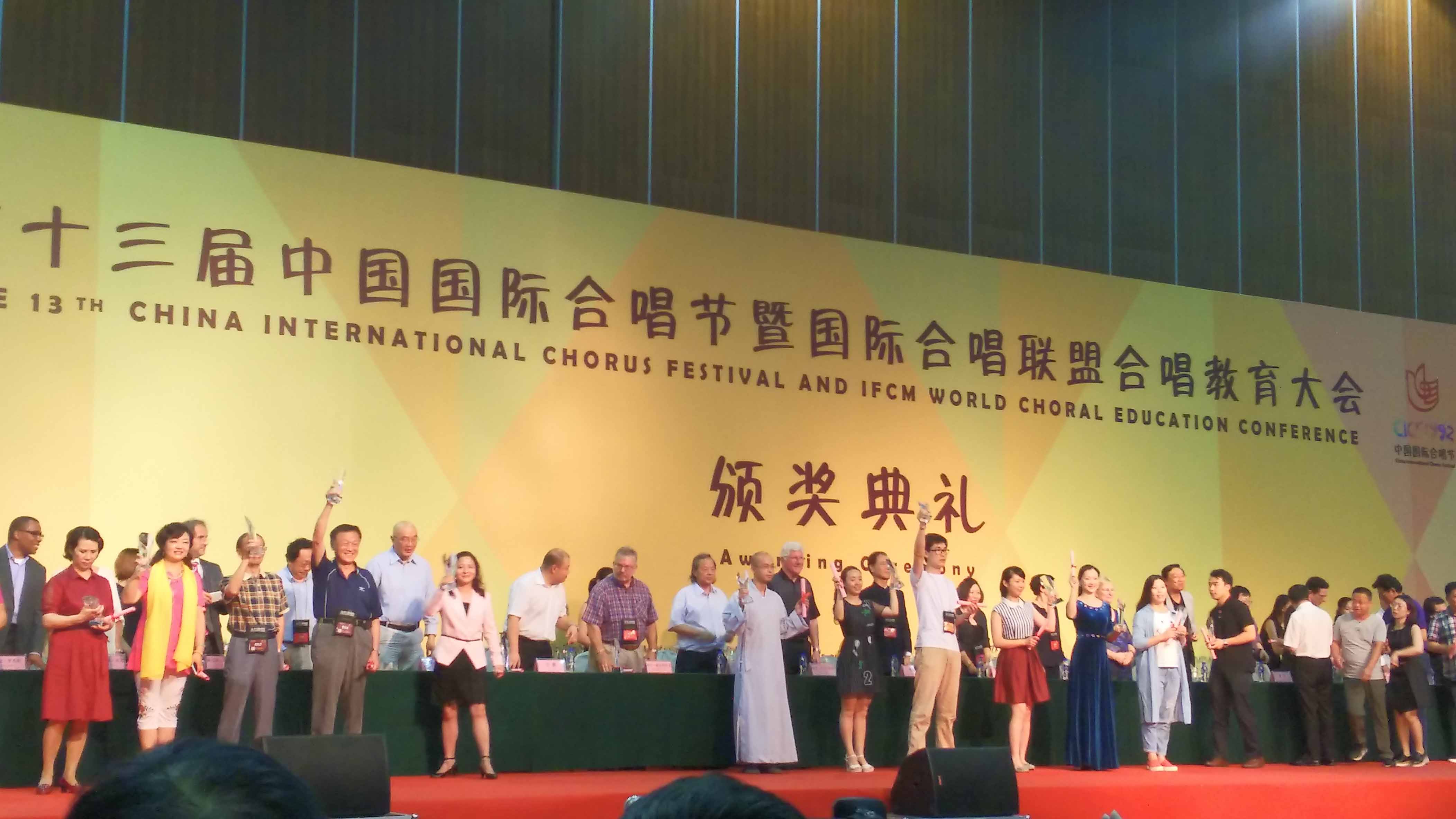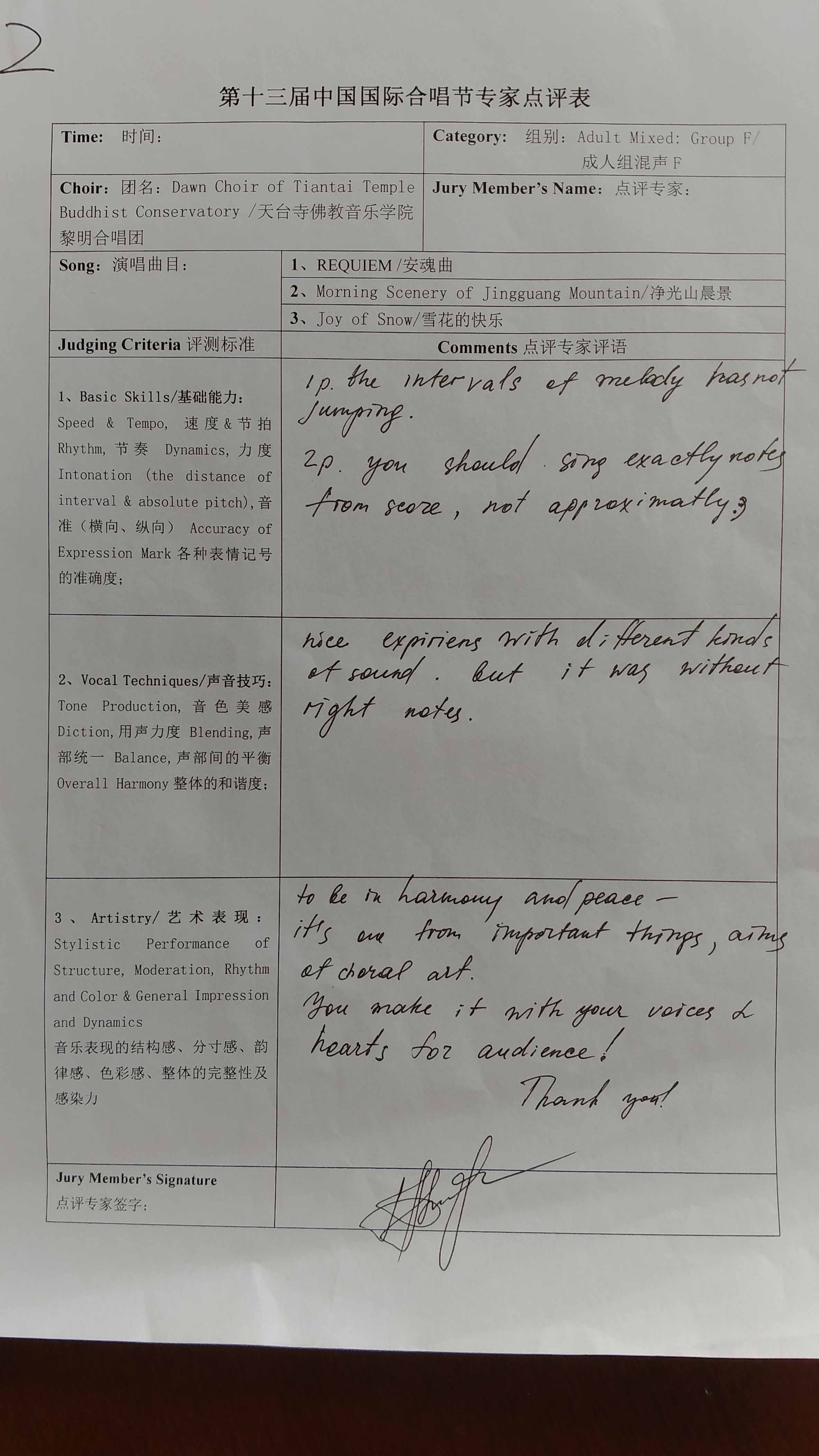 天台寺佛教音乐学院广玄艺术团此次进京,除了全球巡演北京站的演出外,还参加了中国国际合唱节。26日晚作为合唱节中本届也是自举办以来唯一的一支全僧人合唱团来到人民大会堂参加了合唱节的开幕式,29日晚在国图音乐厅参加了中国国际合唱节成人混声组F组的交流演出。广玄艺术团演出了《安魂曲》、《净光山晨景》以及《雪花的快乐(宗教版)》三首作品。 现场观众反响热烈。白俄罗斯音乐学院 合唱指挥学部部长及学生合唱团艺术总监伊涅莎•博德雅克在点评时说,这是一种特别的声音,来自于精神世界的声音。从僧人们的合唱中,能深深感受到他们是在 用生命演绎着和弦,能感受到他们心里充满着爱。广玄艺术团获得了此次国际合唱节成人混声组的C级测评,并在31号的颁奖仪式上接受了获奖证书和奖杯。