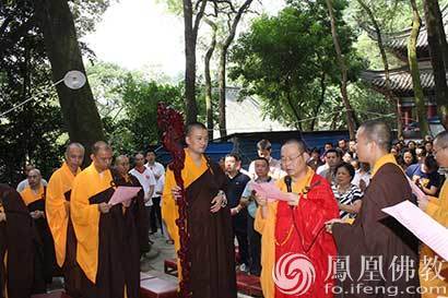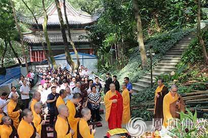 清净僧宝和护法信众齐诵大悲神咒,缓缓行进在古刹云阶,法衣撩动在林间。(图片来源:凤凰佛教 摄影:如本法师)