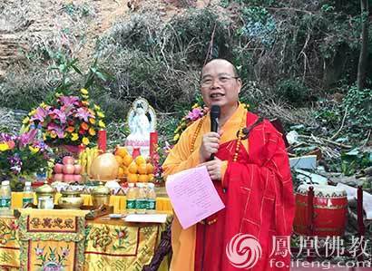 “僧人福地建法堂,供奉三宝法运昌,是日举行破土仪,天龙护持降吉祥”。耀智大和尚为动土说法。(图片来源:凤凰佛教 摄影:如本法师)