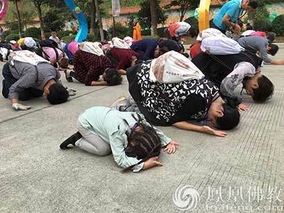 伴随着响亮的“南无本师释迦牟尼佛”佛号,虔诚的信众三步一拜五体投地的朝山礼佛。从山门开始朝拜,经过星云大师铜像、朝山广场、成佛大道、菩提广场到大雄宝殿,历时两个小时。庄严的队伍,吸引大批游客驻足观礼、拍照,甚至有许多人自发性加入朝山的行列。