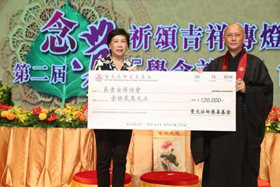 香海正觉莲社副社长何国荣居士向受助机构颁发大支票(图片来源:香港观宗寺,摄影:李杰飞)