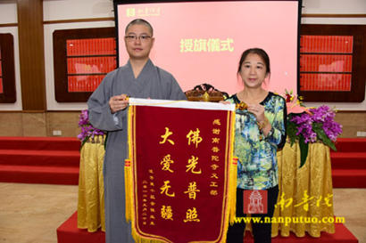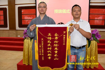 之后,与会人员观看了无尽意梵呗艺术团成立三周年的汇报演出。现场播放了视频短片,回顾义工菩萨们参与台风灾后重建工作的感人瞬间。随后,南普陀寺副寺、义工部部长弘来法师上台代表义工部先后接受禾盛社区书记林金链、流芳里社区业主代表陈阿琳赠予的锦旗,以感谢义工们在灾后社区重建中作出的贡献。