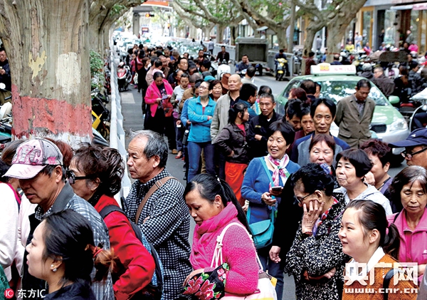 10月11日,百余名市民排起10多米的长队,等待享用免费的午餐。最终由于排队人数超过接待能力,餐厅不得不提前闭门谢客。图片来自央广网