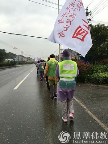 这是“一次说走就走的”朝山。在天开寺举办国庆长假阅藏七期间,宽见法师发出了徒步朝礼九华山的倡议,10月10日便率团从北京出发赴安徽广德灵山寺。宽见法师把一直在推广的奉斋放生和大众阅藏与行脚朝山相结合,沿途宣传并实践这两项内容,亲自带动团员和当地大众体验阅藏和奉斋,使之成为了本次朝山活动最大的亮点。