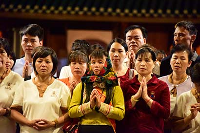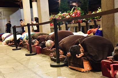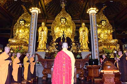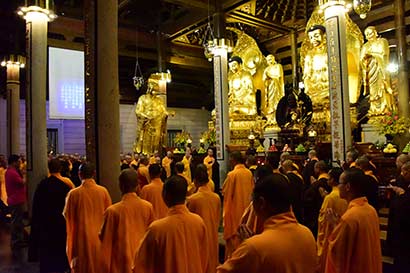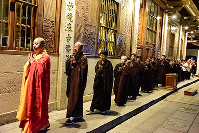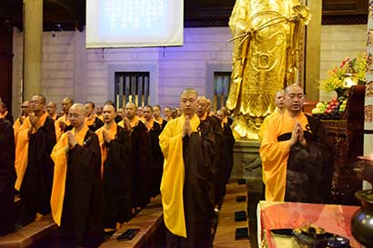 观世音菩萨出家日前夕,寺院山门通宵大开迎十方信众。是日凌晨5时,南普陀寺全体僧众齐聚大雄宝殿,则悟方丈拈香主法,领众持诵经典。僧众和声唱赞,诵楞严咒,虔诚礼佛、绕殿、回向,法会庄严隆重。
