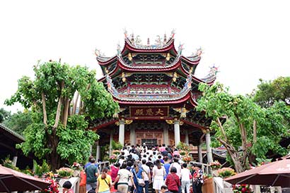 在这殊胜之日,海内外信众游客云集道场,经现场义工、工作人员的引导,信众游客文明礼佛、敬香、瞻仰寺宇,秩序井然。大悲殿前,善信居士于佛前虔诚跪拜,称念“南无大悲观世音菩萨”圣号,道场庄严,佛号声声,与会信众欢喜祥和。