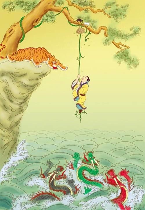 看到这只老虎,旅人顿时明白了白骨的原因,立刻向来时的道路拔腿逃跑。但显然是迷失了方向, 旅人竟跑到一座断崖绝壁的顶上。在毫无办法之中,幸好断崖上有一棵松树,并且发现从树枝上垂下一条藤蔓。于是旅人便毫不犹豫,马上抓着藤蔓垂下去,可谓九死一生。