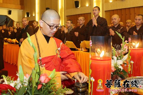 凌晨五时,全体师生排班前往国际会议中心。中国佛学院普陀山学院副院长界定法师为洒净仪式主法并带领大众拈香祈福。