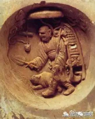 这是国家博物馆藏北宋的一块塔砖。同样是一个和尚,背着“登山包”,戴着雨伞。