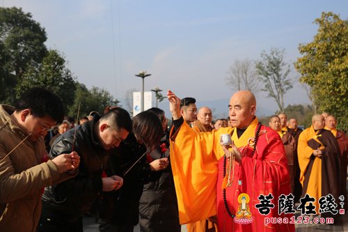 佛日增辉,法轮常转。上午10时,法会礼请中国佛教协会副秘书长、九华山佛教协会会长、百岁宫方丈慧庆大和尚主法。开光仪式、如理如法,法师们诵经祈福,主法法师拈香、说法,杨枝甘露,遍洒清净道场。“用巾拂尘”,满月金容光灿烂,如如不动遍恒沙;“举镜照空”,宝镜当阳超日月,如来普入众生心;“朱笔点眼”,点顶光,无见顶相现化佛。开光功德殊胜行,无边胜福皆回向;普愿沉溺诸众生,速往无量光佛刹。