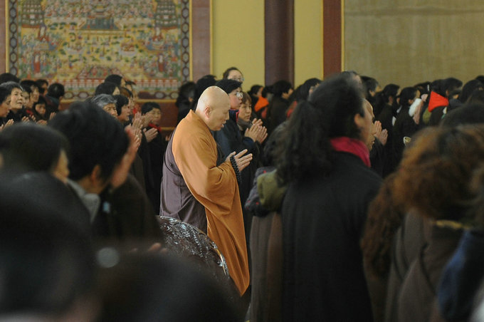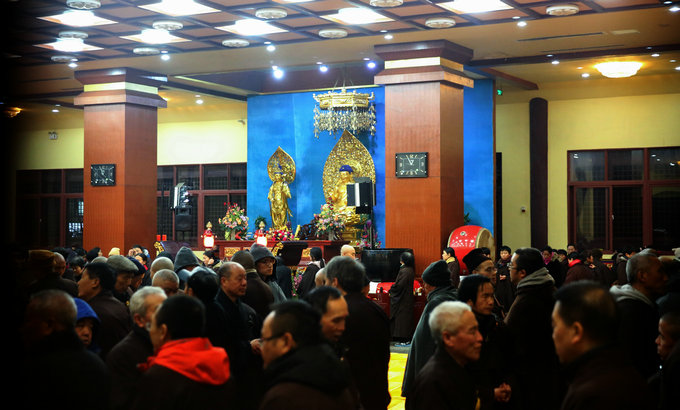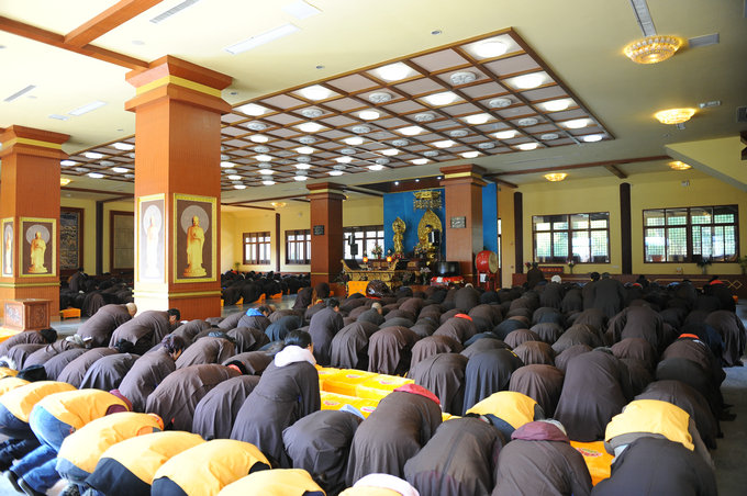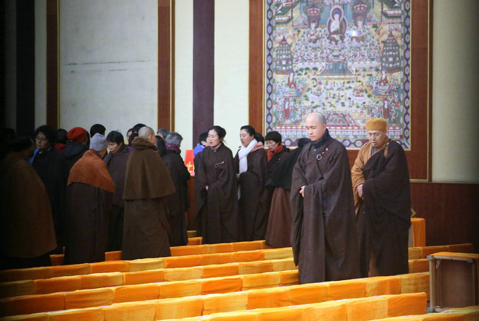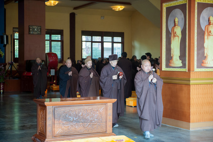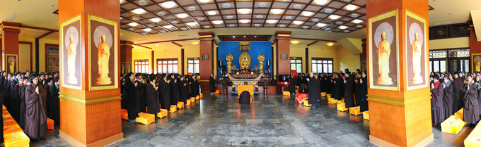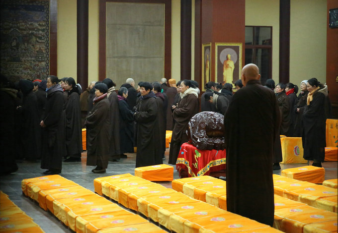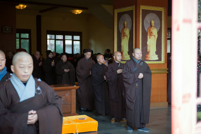 下午3时,悦众师鸣磬击法鼓,四众弟子齐唱《赞佛偈》,清畅哀亮微妙和雅的东林佛号在香光讲堂响起,一昼夜经行法会由此正式开始。