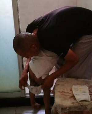法师在给孩子换尿布。(图片来源:资料图)