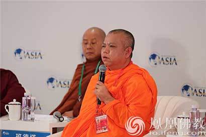 印顺大和尚:狄旺僧王是一位87岁的老人,为了博鳌论坛,为了佛教,为了我们澜湄流域六国的交流活动,他不顾年迈体衰坚持参加了这次论坛。我们在座的六位,穿不同衣服,说不同语言,根据我们的民族文化讲着不同故事,但我们的心是相通的,我们的愿也是相通的,对这个世界,对我们国家和人民的慈悲是没有分别的。在澜湄流域两岸,诞生了我们六个国家众多的民族和灿烂多姿的文化,也诞生了人类最伟大的宗教之一的佛教,包括我们的汉传、藏传、南传三大语系。法乳同源,和合共生。今天,我们澜湄六国的佛教领袖相聚在一起,共同探讨佛教慈悲与智慧的话题,我们同饮一江之水,有着共同的源头;我们敬仰着佛陀,有着共同的信仰;我们关爱无尽的众生,有着追求世界和平,人类幸福的共同愿景。我们文化相通,命运相连。老、柬、缅、越、泰这些国家,佛教都是它们的国教,90%以上的百姓都信佛,佛教成为他们生命和生活的重要组成部分。成为世世代代融入他们灵魂和血液的文化基因。同时在澜湄六国里面,由于历史的缘故,有很多华人,佛教也是他们普遍的信仰。利用佛教加强与周边国家地区的沟通和联系,增进与各国人民的感情,确立中华文明的核心文化圈,同时以佛教争取信仰统一,民族统一,文化统一,这些都是我们的最好选择。