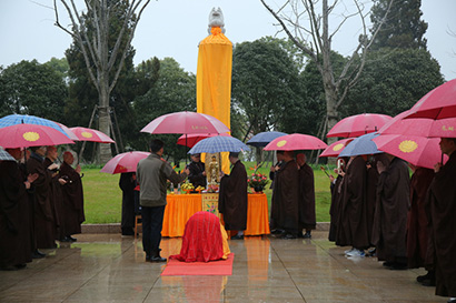 2017年3月12日(农历二月十五),本师释迦牟尼佛涅槃日,上午八时整,东林寺净土苑两序大众云集在净土苑山门广场举行“永久免费入苑”碑刻揭碑洒净仪式,首座悲如法师主法。