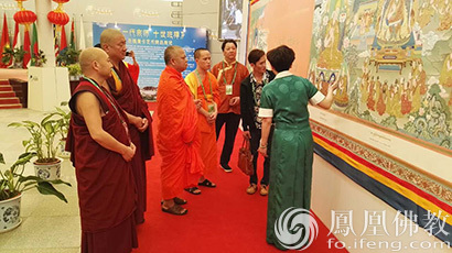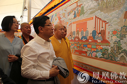 国家宗教局副局长蒋坚永、中国佛教协会副会长印顺大和尚、国家宗教局外事司司长肖红参观唐卡展(图片来源:凤凰佛教 摄影:李保华)