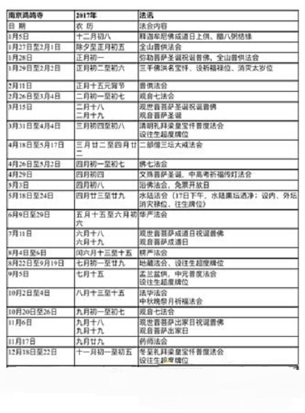 南京鸡鸣寺每周六随晚课往生普佛、每月初一、十五随早课延生普佛,请提前至客堂登记;每月初一、初八、十五、廿三,四天念佛共修,遇法会暂停;每月放生、皈依法会另行通知;供佛斋僧、牌位、皈依、义工报名请至客堂登记办理;觉行夏令营、禅修体验营另行通知;法会时间若有更改,另行通知。
