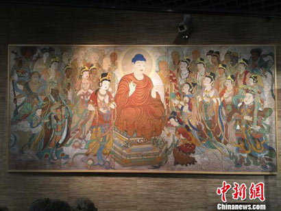 展出的作品壁画《观世音菩萨普门品》。(图片来源:中国新闻网 摄影:周丹)