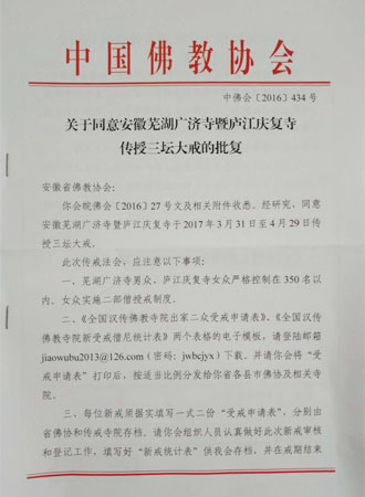 中国佛教协会关于同意安徽芜湖广济寺暨庐江庆复寺传授三坛大戒的批复